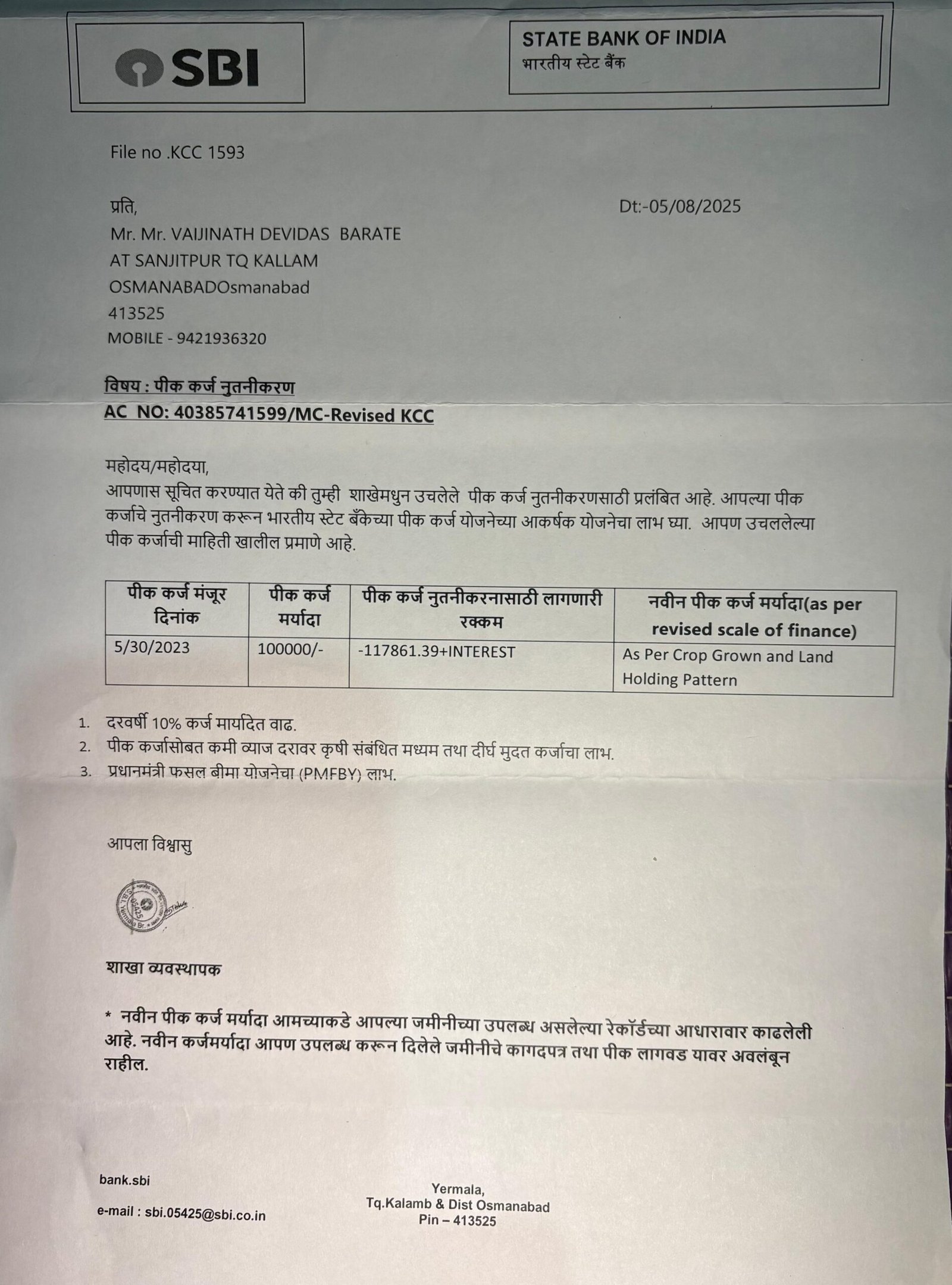 जिल्हाधिकारी किर्ती किरण पुजार यांचे आदेश असताना सुध्दा कर्ज वसुली करीता शेतकऱ्यांना नोटीस पाठवण्याचे चालु आहे. अतीवृष्टी च्या नुकसानीच्या शेतकऱ्यांच्या जखमा अजूनही सुकलेल्या नाहीत. शेती उद्ध्वस्त झाली, जनावरे वाहून गेली, संसार उध्वस्त झाला आणि अशा परिस्थितीत बँकांनी कर्ज फेडण्यासाठी नोटीस पाठवल्या आहेत