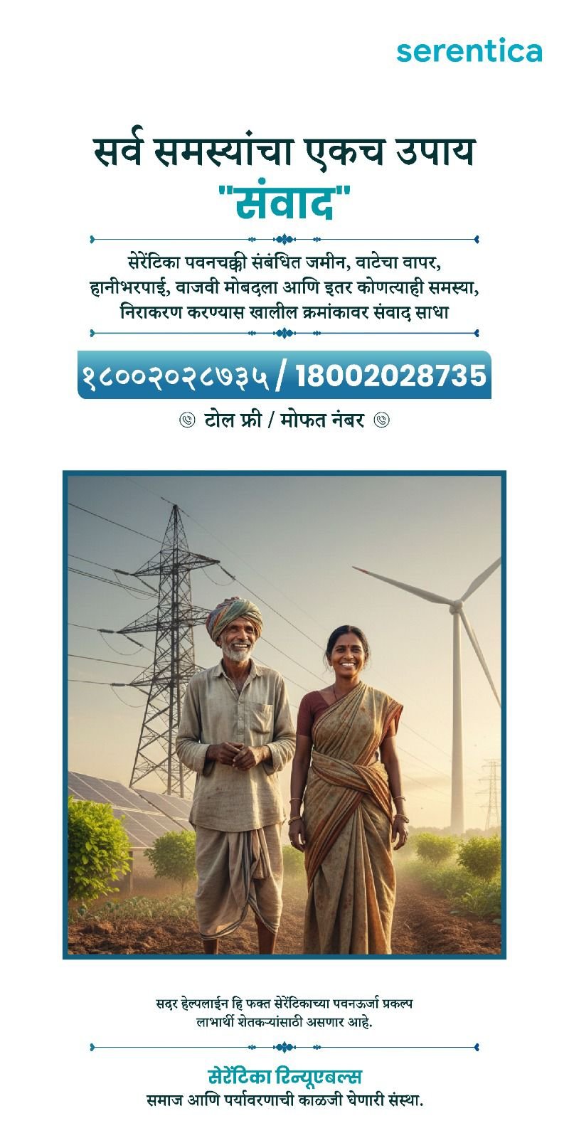 सेरेंटिका कंपनीच्या वतीने जिल्ह्यातील विविध भागात पवनउर्जा प्रकल्प तसेच पवनउर्जा प्रकल्पाच्या विद्यूत वाहिनी उभारण्याचे काम सध्या सुरु आहेत. सेरेंटिकाच्या वतीने हे प्रकल्प उभारताना शेतकऱ्यांना कांही समस्या, तक्रारी असतील तर त्यांनी सेरेंटिकाच्या वतीने नव्यानेच सुरु करण्यात आलेल्या टोल फ्री हेल्पलाईन १८०० २०२ ८७३५ या क्रमांकवर संपर्क साधण्याचे आवाहन सेरेंटिका रिन्यूएबल्स कंपनी कडून करण्यात आले आहे.